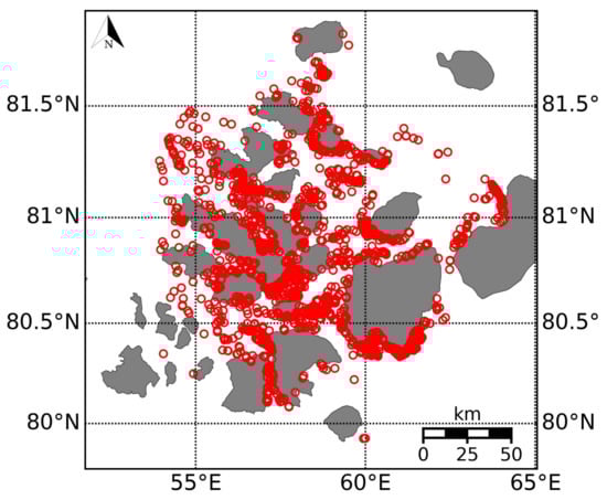 A total of 2292 icebergs manually detected in Sentinel-2 image over Franz Josef Land on 4 April 2017. Grey areas are land. Iceberg positions located in the landmask may be due to geolocation errors or details such as bays that are not present in the landmask.