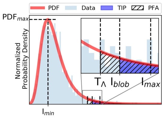 Schematic representation of PDF fitting to the histogram of the data. The dark blue shaded area represents the TIP (see Section 3.4.4) and the hatched region represents the area corresponding to the PFA. is the threshold, and are the lower and upper boundaries used to represent the background data respectively, and is the value of the blob-detected pixel.