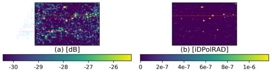 The images were acquired with a temporal separation of 45 min. They were both acquired on descending passes but on different orbits. Therefore, the images differ in their orientation relative to north. The parameters for the blob-detector in the IWS images were selected such that the physical blob-size (in meters) equals the blob-size used for the EWS image. The value of was increased to better represent the iDPolRAD-values obtained for the IWS mode.