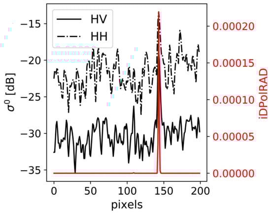 A transect from Figure 6 showing how the iDPolRAD filter enhances the difference between iceberg-value and background-values compared to HH and HV intensities.