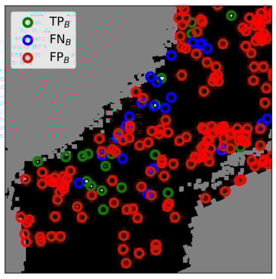 Detected blobs in comparison to manually detected icebergs for and = 0.1 over FJL on 4 April 2017. Grey areas are land. Blobs are classified according to Table 3.