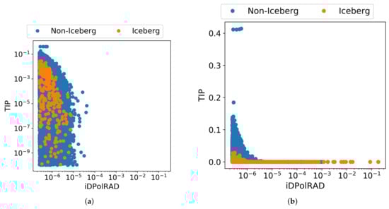 The ‘Tail Integrated Probability’ (TIP) was calculated using the Generalized Gamma distribution with , and the parameters for the distribution were determined from the background as described in Section 3.4.1. In Figure 9 the TIP values for all detected blobs are presented as functions of the iDPolRAD ratio, including icebergs (true positives) and non-icebergs (false positives). The idea was to separate the icebergs from the non-icebergs by choosing an optimal PFA value, for example as maximum of all TIPs obtained for true positives (assuming that the TIPs for non-icebergs are larger than the ones for icebergs).