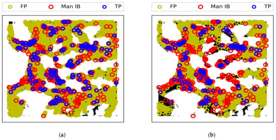 To check whether the first step of blob detection is useful or not we compare the results of the complete processing chain as shown in Figure 4 with the results of excluding the blob detection and only using the CFAR approach. Because it is a very time consuming task when fitting the Generalized Gamma function to the background values each time, we calculated the threshold of the iDPolRAD value only for every tenth pixel and applied linear interpolation to cover the remaining pixels. In the calculations we used a PFA of . The difference in the computation time for the blob detection as first step and the CFAR approach (only applied on blobs) as a subsequent step is large. In our implementation the blob-detector (with = 0.1 and = ) needed about 36 min for the image 4 April 2017 11:46:41 (see Table 8), and the subsequent CFAR detection approximately 24 h. The same time was needed for fixing the threshold for every 10th pixel, interpolating threshold values between them, and carry out the iceberg detection for every pixel. The long computation times needed for the CFAR detector are mainly caused by fitting and numerically integrating the Generalized Gamma function to the background values. For practical applications, this procedure is not directly applicable. The true detection rate is higher for the pixel-by-pixel CFAR detector (271 true detections) compared to including the preceding blob detector (178 true detections). With the two-step approach, 400 icebergs were missed already in the blob-detection step (Table 8, ). However, while the pixel-by-pixel detection resulted in 3980 false alarms (Figure 10a), the detector with the preceding blob-detector ended with 2890 false alarms (Figure 10b). We emphasize that the numbers of false alarms (FP) that we provide in Table 9 are not directly related to the PFA, for which we take only into account the high iDPolRAD values in a SAR image. Here the number of false alarms is determined in comparison to the reference data from the optical images. False alarms are bright signals in the radar image that do not correspond to an iceberg position in the optical image. SAR pixels covering icebergs that do not show high values in the SAR image are part of the background PDF but are counted as missed iceberg in comparison to the optical images. The large number of false alarms (FP) and missed icebergs (FN) demonstrates that it is difficult to reliably distinguish icebergs from other bright appearing objects in the SAR image and that not all icebergs are objects with a strong microwave backscattering response.
