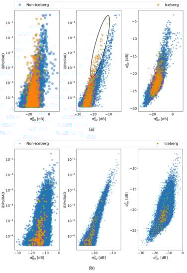 To deepen the understanding of the output obtained from the iDPolRAD filter, we investigated the backscattering characteristics (from the backscattering coefficients and derived from the EWS images). Figure 11 presents the values of icebergs and non-icebergs, both for iDPolRAD and for and . The rightmost plot of Figure 11 reveals that backscattering coefficients of icebergs and non-icebergs cover the same range of values, and the gain in using the iDPolRAD approach becomes clear. However, only at larger magnitudes of and the difference between iDPolRAD values of icebergs and non-icebergs is significant (Figure 11a). This effect is more pronounced at HV-polarization. For icebergs with lower backscattering intensities, however, the iDPolRAD values of icebergs and non-icebergs are similar. This can be interpreted such that not all icebergs are characterized by scattering mechanisms causing strong depolarization. We expect this, e.g., for icebergs with a wet surface or with very low volume scattering contributions due to the lack of strong scatterers in the ice. For the rough fast ice the difference in iDPolRAD values between icebergs and non-icebergs are not as large as for smooth fast ice (Figure 11b). This can be explained by the low backscattering magnitudes of icebergs at HV-polarization in the NA-scenes.