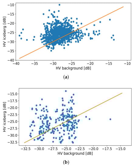 Backscattering coefficients of icebergs and their corresponding background at HV-polarization. Data are from (a) FJL, representing smooth fast ice, and (b) NA, representing rough fast ice. The orange line indicates where the iceberg value equals the background value.