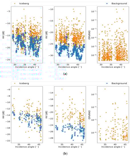 Finally, we investigated the effect of varying radar incidence angles on the detection performance. From sea ice classification in wide-swath images it is known that changes of the incidence angle have to be considered (e.g., [29]). For all blob detected icebergs and their corresponding background (mean value over the training-window) the iDPolRAD-value and backscattering coefficients at HH- or HV-polarization are retrieved with the corresponding incidence angle. The results are presented in Figure 13. The iDPolRAD-values do not reveal any clear sensitivity to the incidence angle in the investigated range from 28 to 46 deg. At a given incidence angle, the backscattering coefficients show large variations both for the icebergs and for the background. Also in this case a clear sensitivity to the incidence angle is not recognizable. However, the background backscattering coefficients reveal a slight decrease with increasing incidence angles in particular at smaller values of and . The latter may arise from smooth fast ice areas (between ridges or other deformation features) for which a decrease of the backscattered intensity as a function of incidence angle is to be expected. For volume scattering from air bubbles in the fast ice volume and for ice ridges, the sensitivity to the incidence angle is in general only weak for the incidence angle range shown here [30].