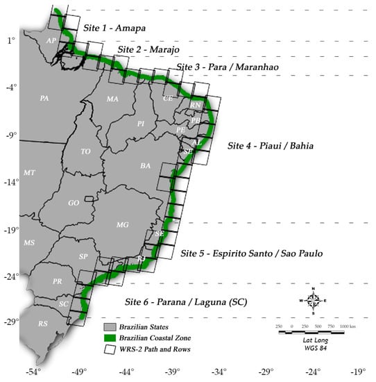 - Dominguez, J.M.L. The Coastal Zone of Brazil. In Geology and Geomorphology of Holocene Coastal Barriers of Brazil; Springer: Berlin/Heidelberg, Germany, 2009; pp. 17–51. ISBN 978-3-540-44771-9. [Google Scholar]