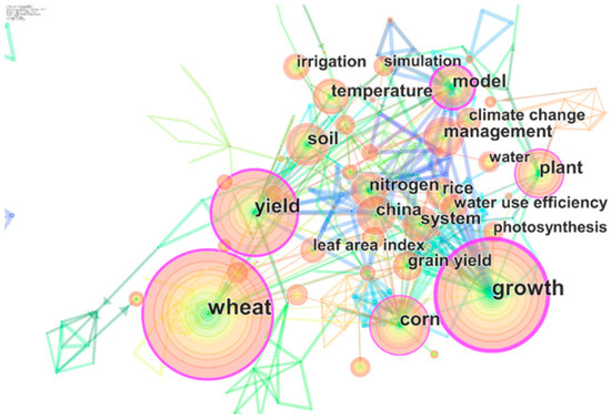 The central nature is another factor that reflects the role of the node in the network. The node with a higher central nature can also show the hotspots and direction of scientific research in recent years. The greater the centrality of the keywords, the more information they control among keywords, and the greater their influence and importance are in the network [21,22]. From Table 1 and Table 2, it can be seen that the keywords with high betweenness centrality in Chinese journals were “remote sensing technology”, “crop growth”, “vegetation index”, etc. However, in English journals, “growth”, “yield”, “model” etc., were the keywords with high betweenness centrality. The above central keywords are, generally in consistent with the high-frequency keywords, which constitutes the main theoretical system in the field of remote sensing growth monitoring in China. To some extent, the research hotspots in the field of crop growth monitoring are highlighted again.