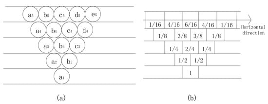 As shown in Figure 1a, when the ball (named ) on the first floor is taken away, one of the balls on the second floor ( and ) will fall, so the probability of falling for each of the two balls is . Then, one of the balls on the third floor will fall, and the falling probabilities for each of the three are , , and , respectively (in Figure 1b). On this basis, the differential equation of the probability distribution function of the sinking event is obtained. For a clear expression, the plane, which is beyond the center of the subsidence basin and the vertical with horizontal, is appointed as the main section. The main section in the strike direction is called the strike main section, and the one in the dip section is called the dip main section. After assuming that the medium is infinitely small, in the main section, the surface subsidence profile equation of semi-infinite mining is