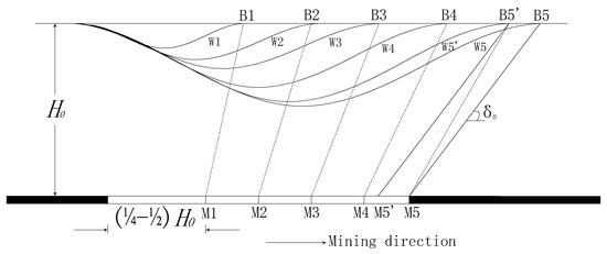 Equation (3) shows that the inflection point was close to the goaf boundary after projection on the horizontal plane. If the red lines (a, b, c, d in Figure 6) are moved by the distance of the deviation of the inflection point toward the side of the coal pillar, they become the goaf boundary. Therefore, according to Equation (4) and the position of the inflection point and boundary point in the main section, the mining depth can be determined. Because the simulation data were ideal (as shown in Figure 5), there was no need to fit the subsidence curve.