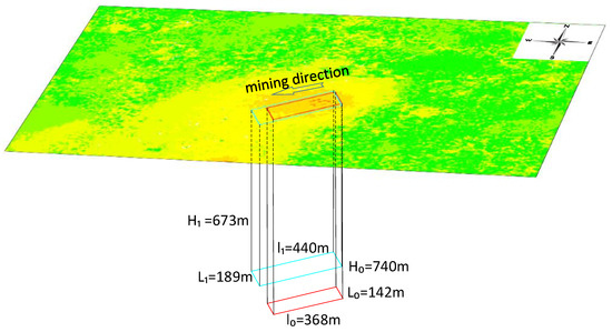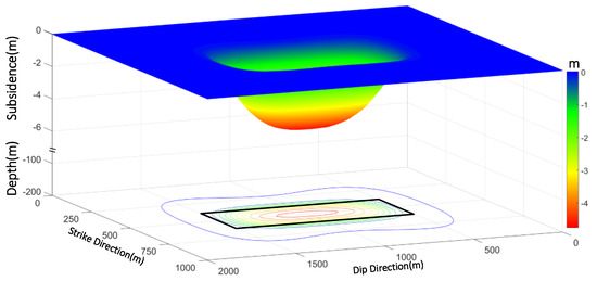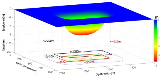 As can be seen in Figure 8, the length of the calculated goaf was smaller than the real one, but the calculated width and depth are larger. According to Equation (5), the depth is directly proportional to the distance from the mining boundary to the basin boundary: thus, the larger the length, the smaller the depth. This conclusion agrees with the experimental result.
