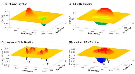 Tilt and curvature in the strike direction and dip direction.The borders of the positive and negative areas are the lines indicated by a, b, c, and d in graphs (3) and (4).