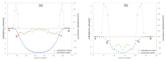 As can be seen in Figure 6, the wave crest and wave trough were opposite to the main section in the dip direction and the strike direction in graphs (1) and (2), respectively. In graph (1), there is a distance between the edges of the hump and the pit, while there is nearly no such distance in graph (2), which indicates that the mining degree in the strike direction is larger than that in the dip direction. In graphs (3) and (4), the curvature was negative at the edge and positive in the center. For the positive areas, the curvature value was large at the edge and small in the center in graph (3); this is contrary to that in graph (4), which indicates that the mining degree was full in the strike direction and subcritical in the dip direction. In order to more clearly show the variation in the subsidence and curvature curves, we obtained the subsidence curve and the curvature curve on the strike main section and the dip main section. The result is shown in Figure 7. In Figure 7, graph (a) shows that the bottom of the subsidence curve was gentle. The value of the curvature curve decreased after first increasing, and it then continued to increase until it was zero from the edge to the center and zero at the inflection point, indicating that the mining degree in the strike direction was full. In graph (b), the bottom of the subsidence curve is sharp. The value of the curvature curve decreased after increasing; it then fluctuated below the axis and was zero at the inflection point, indicating that the mining degree was subcritical in the dip direction.