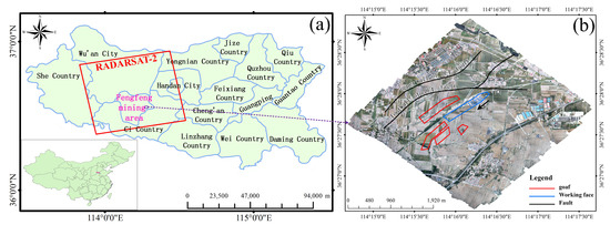 Study area overview. Figure (a) shows the location of the study area and the coverage of RADARSAT-2 images in the study area. In Figure (b), the black arrow indicates the mining direction, and the base map is spliced by UAV images that have a 0.8 m resolution.