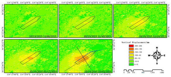 The interference results were used to calculate the surface LOS deformation. The time series surface subsidence can be obtained by projecting the LOS deformation in the vertical direction and stacking the images. If we assume that there is no horizontal movement, then the vertical deformation equals the LOS deformation divided by the cosine of the incident angle. The influence of this assumption is analyzed in Section 5.1.