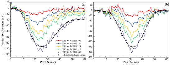 Surface subsidence curves obtained at different periods according to sampling points. (a) The subsidence curve in the strike direction; (b) the subsidence curve in the dip direction. The sampling points were arranged from northeast to southwest and from small to large in the strike direction, from southeast to northwest and from small to large in the dip direction.