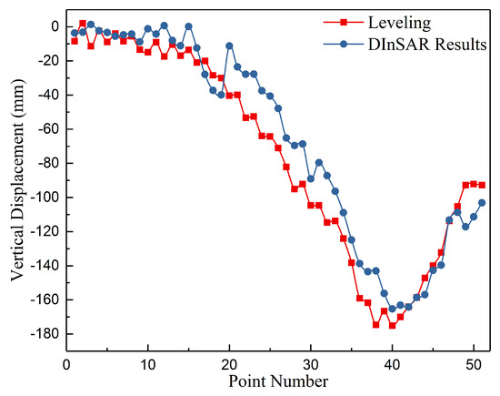 Observed errors inevitably occur when using DInSAR to obtain surface deformation. In addition, the LOS deformation monitored by DInSAR is directly transformed into vertical deformation without considering the horizontal movement in the real data experiment. In order to verify the accuracy of the DInSAR monitoring results, the leveling data above the working face were used. The blue triangles represent the positions of the 51 leveling points arranged from northeast to southwest in Figure 10. The dates on which the first and last leveling data were measured were 10th October 2015 and 4th March 2016, respectively, which are similar to the acquisition times of the first and last SAR images. If the subsidence rate is regarded as a constant value, a time difference of two days will lead to an error of only 2.3%, so the influence of time inconsistency is very small. The comparison is shown in Figure 13.