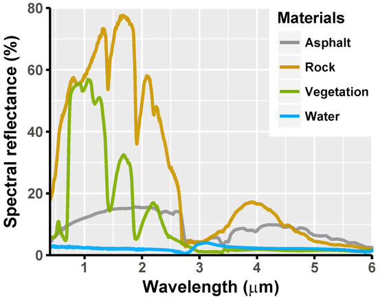Spectral reflectance of different man-made and natural features (Data obtained from the NASA ASTER Spectral Library [7]).