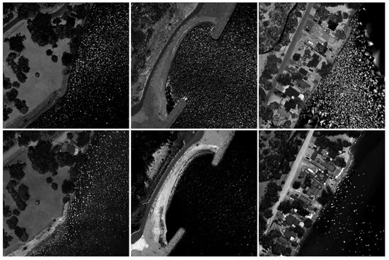 The above experiment successfully demonstrated that SLIER is capable of removing the extreme intensity values on the water surface and improving the separability between land and water regions. All these can subsequently lead to an accurate land-water classification using multispectral airborne LiDAR data. To prove the same capability of SLIER toward monochromatic airborne LiDAR data, additional experiments were carried out using a single-wavelength (1064 nm) LiDAR dataset collected by an Optech Galaxy on a near-shore region of Lake Ontario, Bowmanville, Ontario, Canada. The data were acquired on 30 May 2018, where the system settings of Galaxy were: PRF = 350 kHz, SF = 40 Hz, SA = ±30° and flying altitude ≈600 m. We intentionally examined two data strips collected in different directions, where the first data strip was collected perpendicular to the shore while the second strip was acquired parallel to the shore. The following Figure 13 shows the LiDAR intensity data of the two data strips.