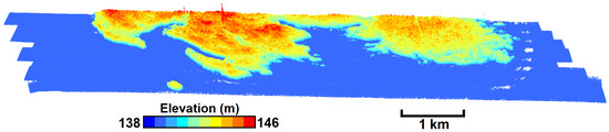 We utilized a multispectral airborne LiDAR dataset collected by Optech Titan for experimental testing and evaluation of the SLIER. The Optech Titan is equipped with three laser channels, where Channel 2 (1064 nm) points at nadir and Channel 1 (1550 nm) and Channel 3 (532 nm) are tilted in the forward direction with 3.5° and 7° off nadir, respectively. Table 1 summarizes the configuration of the multispectral airborne dataset. Most previous research has investigated areas with substantial height differences for man-made shore regions [31,38]; therefore, we intentionally acquired a multispectral LiDAR dataset that mostly covers a natural shore water environment. This dataset is an open dataset found available under the ISPRS Commission 3 website with courtesy of Teledyne Optech [39]. Eight multispectral airborne LiDAR data strips were collected by Optech Titan covering a natural rocky shore area located in Tobermory, Ontario, Canada. The survey was accomplished during July 2015 with a flying height of approximately 500 m and a flying speed 140 kn. With a scan angle of ±20°, the survey extent covers an area of approximately 26.82 km2. Since a relatively high PRF was used (roughly 625 kHz), a high density of data was collected during the flight mission. The total number of data points collected was 787 million, leading to a mean point density of 8.97–11.38 points/m2 and a mean point spacing of approximately 0.3 m. Figure 5 shows the multispectral airborne LiDAR dataset colourized based on the elevation.