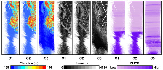 Figure 7 shows a shore region of the multispectral LiDAR data displayed in individual channels together with the derived SLIER. Based on the displayed figures, one can easily note that the laser dropouts appeared significantly in the water region at large scan angles, particularly in Channels 1 and 2, resulting in a large portion of missing data found at the swath edge. Since the green channel is capable of collecting both the water surface and the bottom, the effect of laser dropouts was not obvious in Channel 3. Regarding the intensity value, extreme peak intensity values were found close to the nadir region, regardless of the laser channel. All these properties resulted in high SLIER values being computed in Channels 1 and 2 on the water region, whereas this effect was not obvious in the SLIER computed using Channel 3.