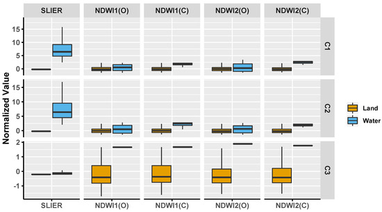 Since multispectral airborne LiDAR datasets were acquired in this study, two NDWIs could be derived based on Equation (1). NDWI1 here refers to the NDWI derived by using the intensity of Channel 3 (532 nm) as and the intensity of Channel 2 (1064 nm) as . On the other hand, NDWI2 was derived using the intensity of Channel 3 (532 nm) as and the intensity of Channel 1 (1550 nm) as . Since the values of SLIER and NDWIs are unitless, it is not scientifically sound to compare their absolute values. Therefore, the values of SLIER and NDWIs were first normalized using their respective mean and standard deviation based on the z-score. Afterwards, the boxplots of land and water data samples were generated based on SLIER, the two NDWIs derived using the corrected intensity data (as reported in Equation (4)) and the two NDWIs derived using the original intensity data (see Figure 8), where the box represents the interquartile range (IQR) of the data (i.e., 25th–75th percentiles). One should note that the corresponding row shown in Figure 8 refers to the selection of the core channel. For instance, the first row indicates that C1 is the core channel, where the intensity values of the nearest C2’s and C3’s points are assigned to C1 in order to compute the NDWIs.