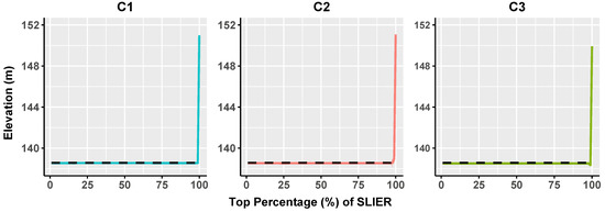 Based on the above-mentioned analyses, it is proven that SLIER is able to provide a good separability between land and water regions. Unlike traditional NDWIs where a threshold of zero can be used as a cut-off value for extracting certain water bodies, we should analyse the strategy of how “large” the SLIER value should be in order to identify the data sample points and determine the water surface region. As a result, we plot Figure 10, which shows the top “X” percentage of SLIER with respect to the extracted data sample points’ elevation for the three LiDAR data channels. The dotted grey line represents the instantaneous water surface elevation computed based on the identifying water region from the aerial photos.