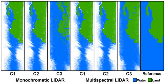 Since there is a lack of field survey or existing archived coastline for the land-water boundary, the classified point clouds were checked against the reference land and water polygons that were manually digitized with reference to the aerial photos and the LiDAR data. Accuracy assessment was performed by computing the kappa statistics, overall accuracy (OA) and the respective producer’s accuracy (PA) and user’s accuracy (UA) for the land and water class. Various rounds of experimental tests were conducted in order to compare the difference of using monochromatic LiDAR and multispectral LiDAR data for land-water classification.