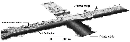 The computed OA based on the reference data yielded 99.27% in this case study, which is similar to the aforementioned case study. The PA of land and water was 99.54% and 98.42%, respectively, whereas the UA of land and water was 99.51% and 98.53%, respectively. The classification result successfully identified the shore boundary and preserved those near-shore features, such as the two rocky piers near Port Darlington, Ontario, Canada. One can note that the misclassified points can be attributed to the appearance of aquatic vegetation and wetland found on the Bowmanville Marsh. Since the study area has an obvious elevation difference between the land and water regions, a monochromatic airborne LiDAR dataset is mostly capable of producing a high accuracy in land-water classification.