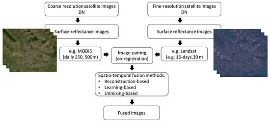 Since its launch in the early 1970s, and especially after allowing the public access to the enormous data archives [39], Landsat data products have been used in different climate, biodiversity, water or agriculture mapping studies. These data products have a great potential to accurately map land cover classes and to monitor land surface parameters. However, these data have a revisit time of only 16 days and therefore, their potential use for monitoring gradual changes such as changes in vegetation phenology or soils moisture, just to give a few examples, is rather reduced, especially in cloudy areas (e.g., tropical areas), where only a few cloud-free images per year are available. NASA’s MODIS sensor, on the other hand, acquires data twice a day which makes them more suitable for various surface dynamics mapping. Therefore, to increase the temporal resolution of fine spatial resolution images, many spatiotemporal image fusion methods have been developed during the last years. These methods use spatial information from the fine spatial resolution images and temporal information from coarse resolution satellites images to generate high spatial-temporal images. Spatiotemporal image fusion methods apply several steps to generate high spatiotemporal images: (1) both coarse and fine-resolution satellite images Digital Numbers (DN) have to be atmospherically corrected; (2) the pair-images have to be geometrically corrected and (3), in the end, one of the existing spatiotemporal fusion methods is applied to generate images which are at an increased spatial and temporal resolution (Figure 1). When the application required, calculation of indices before spatiotemporal fusion is performed [40].