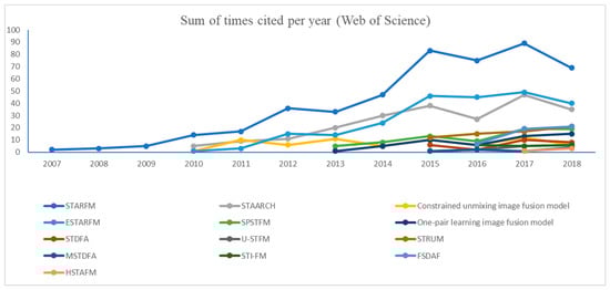 Sum of citations per year for each spatiotemporal image fusion method included in Table 1. Reported citations are recorded in the Web of Science database.
