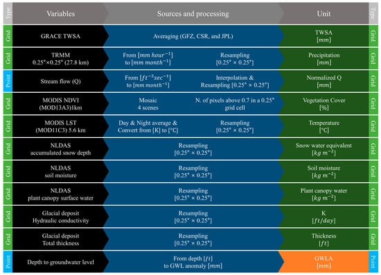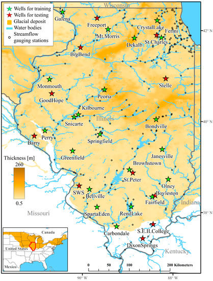 Since aquifer heterogeneity is significant in the glacial deposit, integrating subsurface information about the aquifer material in the ML model is crucial. Gridded hydrogeologic properties for the glaciated United States were developed by Bayless, et al. [] from water-well drillers’ records. From this product, hydrogeologic information, such as hydraulic conductivity and thickness of the glacial deposits, was extracted and used in the model. The data can be obtained from the USGS’s Science Base website, https://www.sciencebase.gov/catalog/item/58756c7ee4b0a829a3276352; access date: 8 August 2017). A sample gridded map showing all the input variables used in the methodology is shown in Figure 4.