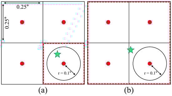 Distance-weighted average scheme showing how input data were extracted from grid cell nodes (symbol: red dot) based on the location of groundwater measurement station (symbol: green star) and a distance threshold value of 0.1° (a) when a groundwater measurement station is within the threshold distance from grid cell node and (b) a groundwater measurement station is located outside of the threshold distance from the grid cell node.