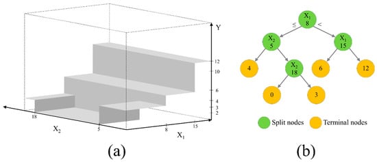 Figure 5 shows how a tree-based regression divides a covariant space by partitioning the predictor variables [] and creates a simple tree-based model. A dataset space indicates a relationship between predictors (X1 and X2) and predictand (Y) so that the predictand value can be approximated by many rectangular subspaces (Figure 5a) according to values of X1 and X2 and the splitting that forms the tree (Figure 5b). The method builds binary trees that partition the data into two samples at each split node. The variable for splitting and its split value are selected based on the conditions that best fit the data. In the example in Figure 5b, at first, the covariant space can be divided at X1 = 8. This is based on the splitting (X1 ≤ 8 and X1 > 8) that can represent the covariant space most effectively in terms of residual error. Consequently, the second split points will be selected in both the X1 ≤ 8 and X1 > 8 regions. The number of split nodes determines the tree size; the increase in tree size is controlled either by a predetermined tree size or by residual error.