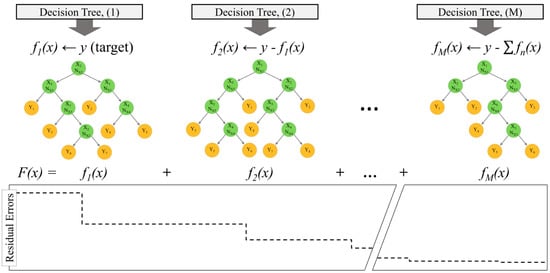 During boosting, a series of several simple trees is built based on the results of the prediction residuals of the preceding tree. Figure 6 shows a schematic of successive regression trees based on residuals. As shown in Figure 6, Decision Tree (2) is built based on a tree (partition) fitted to the residuals from Decision Tree (1), while Decision Tree (3) is a tree (partition) fitted to the residuals from Decision Tree (2). This helps to find a partition (Decision Tree (M)) that will further reduce the residual (error) variance for the data (as shown in the bottom graph of Figure 6). As a result, boosting decision trees improves their accuracy, often dramatically []. In boosting, decision trees are fitted iteratively to the training data and the algorithms vary in how they quantify lack of fit and select settings for the next iteration []. In this study, LS Boost (least-squares regression) algorithm was used for BRT modeling (see Friedman []). Optimization of hyperparameters (e.g., number of learners, maximum number of splits, and learning rate) (see Elith, Leathwick and Hastie [] for details) and overall model design and simulation was conducted using MATLAB® 2017b. The model was constructed and tested using 10-fold cross-validation to determine the optimal hyperparameters, number of learners, maximum number of splits, and learning rate.