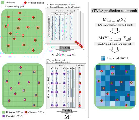 A two-stage ML approach was used in this study to generate a downscaled GWLA grid from GRACE TWSA. The first stage involved building multiple temporal GWLA prediction ML models (M1, M2, ..., M21) for individual groundwater wells in the study area (top left section of Figure 7). The second stage comprised of integrating these multiple models (from the previous stage), along with additional spatial information about the glacial deposit (e.g., hydraulic conductivity), into a single spatial downscaling model. In the second stage, a single spatial GWLA prediction model (M′) was produced for the entire study area (bottom left of Figure 7) and used to generate a downscaled GWLA at 0.25° x 0.25° resolution (the right section of Figure 7). As shown in the figure, the GWLA at a given month can be predicted (1) using GWLA predicted based on individual temporal models of training wells and water-budget variables (X) and (2) using two dimensional GWLA pattern generation based on intermediate variables (Y’) from the first models and spatial characteristics (Z) for each grid cell.