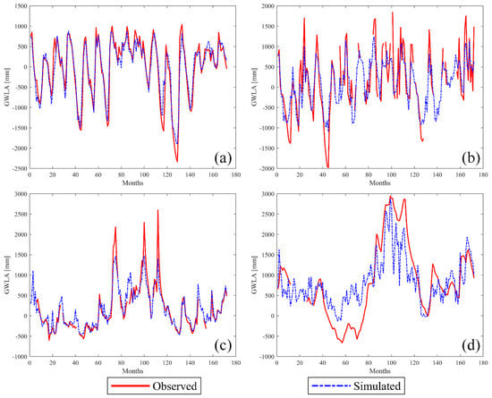Time series graphs showing model-simulated and in-situ-derived GWLA for selected groundwater measurements stations: (a) Bondville, (b) Fermi, (c) Galena, and (d) Kilbourne. The blue line shows model-simulated while red is observed GWLA.