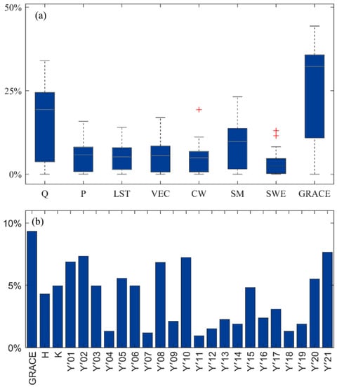 GRACE has twin satellites that measure gravity. Through a series of processing steps, the gravity anomaly measured by GRACE satellite is converted into monthly TWSA, with a spatial resolution of several hundred kilometers. GRACE has provided unprecedented opportunities for the science community despite the limitations inhibited by its coarse spatial scale (e.g., 200,000 km2). It has been used to understand regional and global trends in water storage changes [,,,], assess hydrologic extremes [,,], and investigate water deficit, drought management [,,], and surface reservoirs and lakes []. Combined with other satellite data (e.g., water level from satellite altimetry, vegetation from Moderate Resolution Imaging Spectroradiometer (MODIS)), GRACE has been used to understand the water dynamics of several river basins [,].