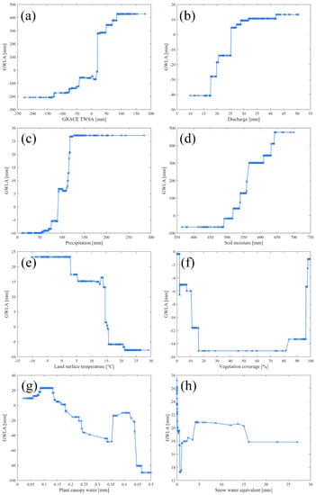 Figure 10 displays the Partial Dependence (PD) plots for selected models, which show the effect of a given variable on the response (predictand) after accounting for the average effect of all other predictor variables. Generally, there is a non-linear relationship between the predictor variables and the predictand (GWLA). The partial responses show a direct relationship between GWLA and GRACE TWSA, stream discharge, precipitation, and soil moisture. However, the magnitude effect of these predictor variables on the GWLA is different (see the y-axis of the graphs in Figure 10). The GRACE TWSA and soil moisture control a wider range of the GWLA. The GWLA has an inverse relationship with land surface temperature and plant canopy water, as these predictor variables increase as the GWLA decreases. LST and CW favors evapotranspiration while reducing recharge. No clear relationship exists with vegetation coverage (greenness index) or snow water equivalent. The relationship between vegetation coverage and GWLA is not direct (Figure 10f), where GWLA responds to little to no vegetation and high plant periods.