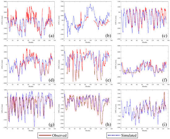 Monthly timeseries model-predicted (blue line) vs. in-situ-derived GWLA (red) for test wells in the study area: (a) Barry, (b) Big Bend, (c) Fairfield, (d) Freeport, (e) Good Hope, (f) St. Charles (g) St. Peter, (h) Stelle, and (i) SWS stations.