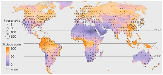 Global distribution of Global Reservoir and Dam (GRanD) Database reservoirs [12]. Reservoir counts are summarized at 5° resolution), and percent daily cloud cover is based on MODIS MOD09GA [34] (2003–2014, 1 km resolution, Robinson projection).