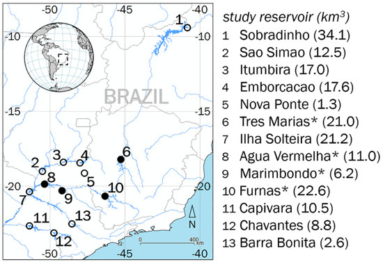 Reservoirs are critical global infrastructure that occupy at least 26 × 104 km2 (0.2%) of global land surface area and contribute 6 × 103 km3 (0.0004%) of global freshwater storage [1]. The freshwater held by reservoirs is essential for meeting global demand for drinking water, irrigation water for agriculture [2,3], and hydroelectric power generation [4]. Recent research has identified the dual roles of reservoirs in atmospheric carbon dynamics being large-scale sites of both carbon sequestration as well as greenhouse gas emission [5,6,7,8,9,10,11]. Tropical reservoirs only make up 15% (1040) of the 6824 Global Reservoir and Dam (GRanD) Database reservoirs [12] but play a relatively outsized role in atmospheric carbon flux compared to temperate reservoirs [13,14,15,16,17,18]. Consistent, systematic, and long-term monitoring of reservoir storage throughout drought as well as high precipitation periods is essential to understanding the role of tropical reservoirs on society and environment [8,16]).