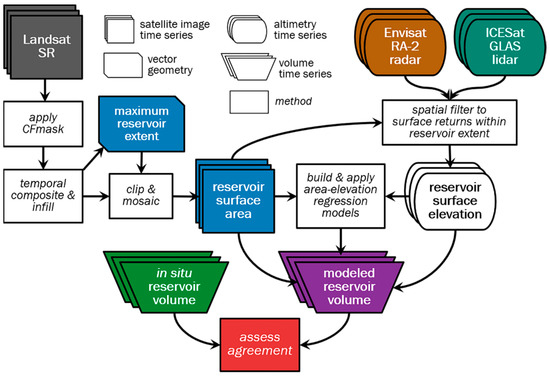Overview of analytical framework to generate surface area, elevation, and volumetric time series for a given reservoir. Colors shown for each dataset are consistent throughout all figures.
