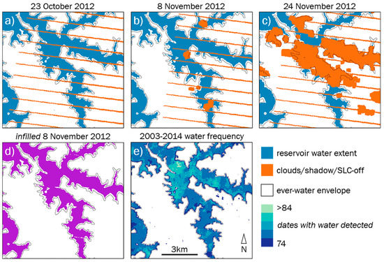 The 13 study reservoirs collectively span 15 Landsat WRS-2 path-row footprints, with three reservoirs stretching across 2–4 footprints, respectively. A total of 1460 Landsat 5, 7, and 8 surface reflectance (SR)-corrected scenes with 20% or less cloud cover were collected from 2003 through 2014; this cloud cover threshold reduced the likelihood of missing data due to cloud cover while still supporting an intra-annually dense time series. We measured surface water time series with the commonly used Modified Normalized Difference Water Index (MNDWI), which is effective at discriminating water from non-water features [57]. We included all pixels that have a MDWI value larger than 0.1 as ‘water’ for each image date. Missing pixels associated with clouds, shadows, and Landsat 7’s Scan Line Corrector (SLC) Error data gaps were identified and removed using Landsat’s CFmask product. For each image’s missing pixels, pixels from images collected within a 36-day window before/after (e.g., Figure 4a–c) were infilled into the image, prioritized by the nearest date of observation (e.g., Figure 4d). Infilling using a 36-day temporal window ensured inclusion of images from up to two along-track (every 16 days) and up to four across-track (7 or 9 days) observations and reduced the amount of missing data within an average reservoir from 8.6% to 1.2% (Figure 5). On some dates, an image’s missing pixels could not be directly infilled through temporal compositing; in this case, if these missing pixels were in locations classified as ‘water’ on at least the median frequency for a given reservoir, the missing pixels were automatically included in the surface water extent. A reservoir’s water frequency map showing the total number of days when ‘water’ was detected (Figure 4e) was also used to generate a consistent spatial extent within which surface water area was measured: pixels classified as ‘water’ on at least two dates made up an ‘ever-water’ envelope for this purpose (shown in Figure 4). Finally, each reservoir’s surface area time series was clipped by an integrated (i.e., upstream to dam wall) reservoir region that was visually interpreted using very high-resolution imagery hosted by Google Earth.