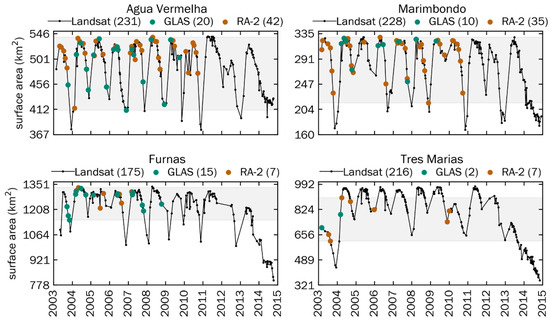 Landsat-derived surface area time series for four reservoirs with dates of ICESat GLAS (green dot) and Envisat RA-2 (red dot) measurement. The gray background indicates the range of surface areas measured on altimetry data collection dates. Time series for all 13 reservoirs are shown in Figure A1.