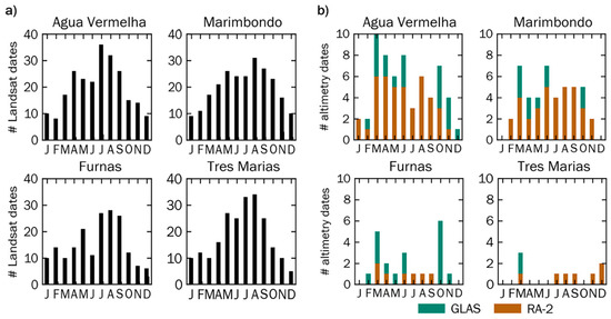 While each reservoir’s seasonal dynamics are apparent, there was often a disproportionate exclusion of cloudy wet season imagery (October–March; Figure 7a and Figure A2). Conversely, since cloud-free observations are more likely in eastern Brazil during winter months, there is a relative abundance of imagery available in July and August when reservoirs tend to be near capacity. Fewer images and generally more cloud cover during the wet season meant fewer near-date images for infilling and compositing, which may yield a larger amount of residual missing data and low biased surface area estimates [33], as well as fewer surface area measurements with which to couple elevation data. While the collection of surface elevation values was not affected by atmospheric conditions in the same way as surface area measurements, having a larger surface area (unobstructed by clouds) meant that more altimetric returns could be collected over the reservoir body (Figure 7b and Figure A3).