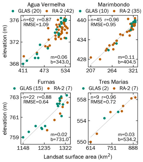 Derived surface area–elevation linear regressions for four selected reservoirs based on Landsat surface area and combined GLAS and RA-2 elevation data. n = number of area–elevation pairs, r = Pearson correlation coefficient, RMSE = root mean square error, m = linear slope, and b = linear intercept. Area-elevation models for all 13 reservoirs are in Figure A4.