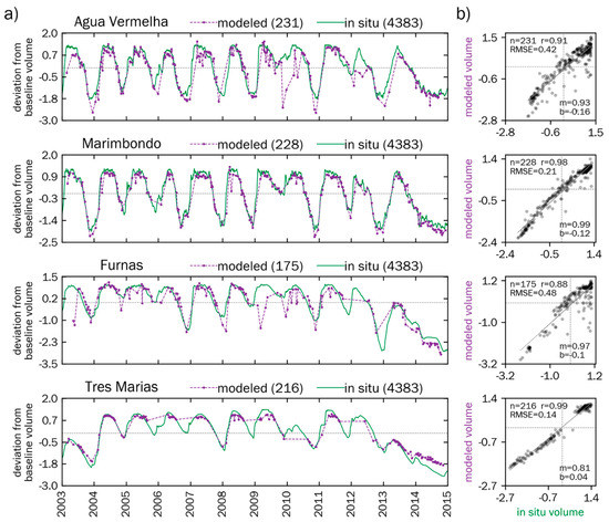 Changes in modeled reservoir volumes were compared to a median 4383 daily in situ reservoir volume measurements collected from 2003–2014 by the Brazilian Electric Sector available at http://www.ons.org.br/. However, study reservoir boundaries deviated from (unavailable) management boundaries used by the Brazilian Electric Sector to collect in situ volume and modeled and in situ volume time series could not be directly compared. To mitigate this disparity, both time series were standardized to preserve relative variations with the following equation: