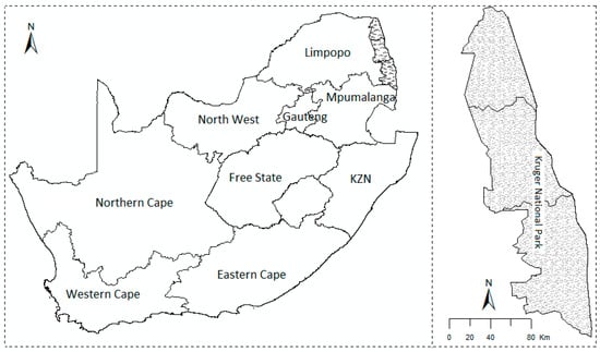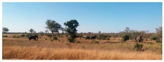 The study was conducted in the protected Kruger National Park (KNP), which covers sections of the Limpopo and Mpumalanga provinces of South Africa (Figure 1). The park is characterized by arid to semi-arid savanna biome, with gentle slopes that make it suitable for wildlife grazing (Figure 2). The area has a humid subtropical climate, with cool–dry winters and hot–wet summers. Annual average rainfall ranges between 0 and 553 mm, with annual average summer and winter temperatures of 28 °C and 16 °C, respectively. The dry season stretches from mid-June to mid-November and the wet season ranges from mid-November to early July. The dominant vegetation cover in the area includes grasslands, mopane, marula and acacia trees, etc.