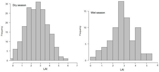 Kruger National Park field LAI measurements ranged between 0 and 7.18 m2/m2 (n = 119, mean 3.02 ± 1.18 m2/m2) for the wet season and between 0 and 5 m2/m2 (n = 74, mean 2 ± 1.17 m2/m2) for the dry season, respectively (Table 3). It was evident that the protected area had a greater LAI during the wet season when compared to the dry season demonstrating highest levels of savanna ecosystem productivity during the period. Figure 4 shows the histogram of LAI for dry and wet seasons. It can be observed that the LAI followed a normal distribution curve for both the dry and wet seasons.